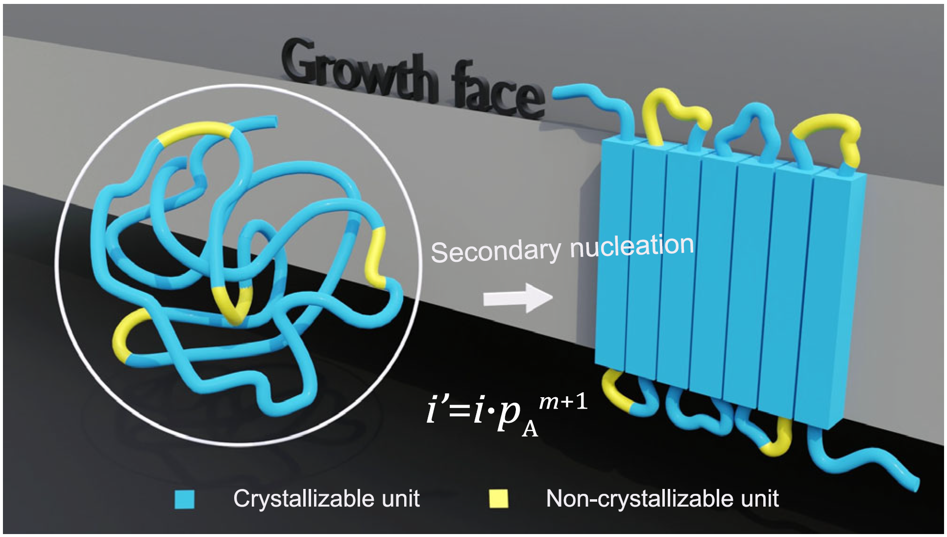 近日,乐鱼在线平台化工系徐军课题组基于无规共聚物结晶成核过程中对分子链上可结晶单元随机选择的概率模型(图1),建立了基于成核动力学测定临界晶核尺寸的理论方法,成功测定了稀溶液中聚丁二酸丁二酯单晶生长晶面上的次级临界晶核尺寸。