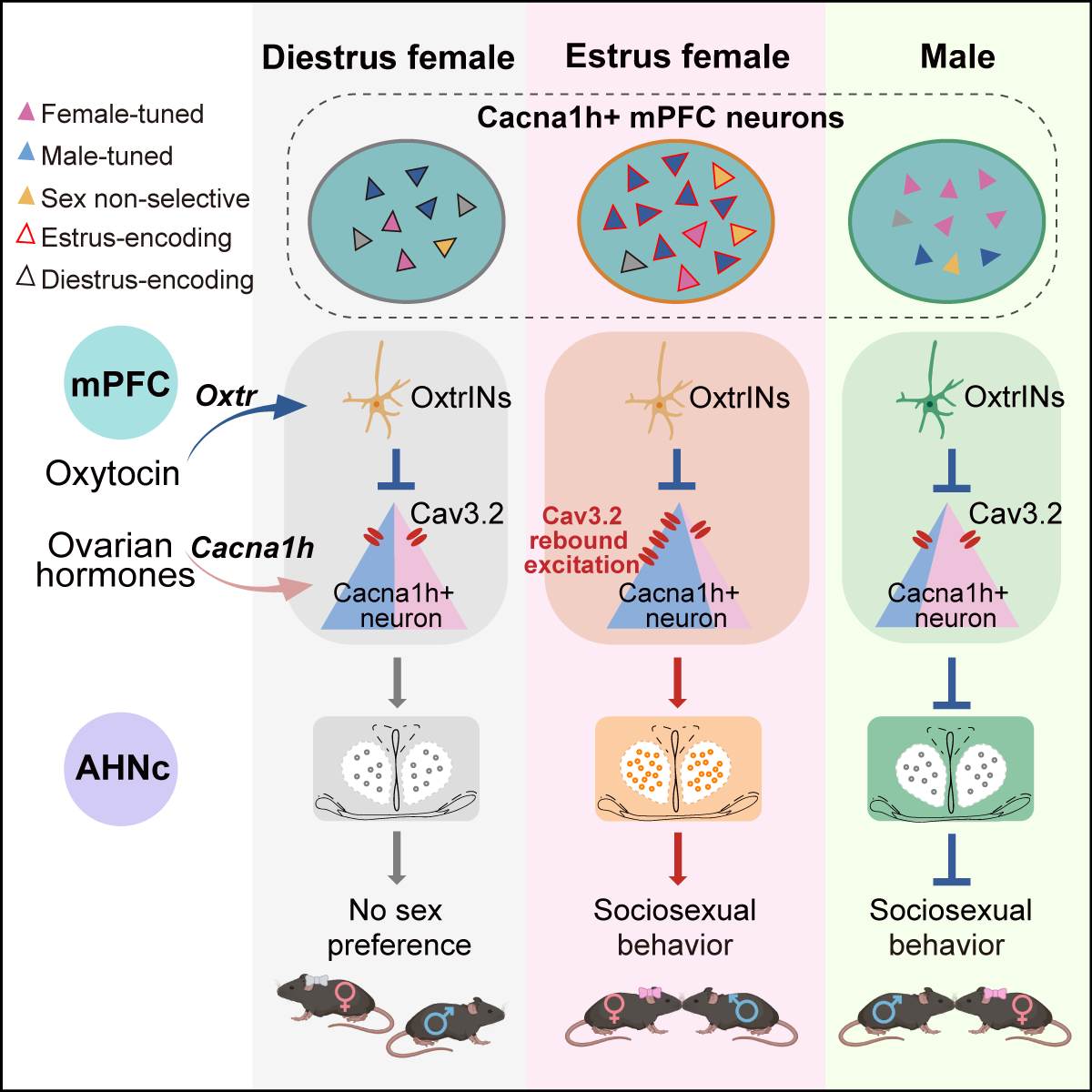 该研究聚焦于内侧前额叶皮层,鉴定出一类特异表达Cacna1h的神经元群体,作为调控“恋爱兴趣”的关键神经单元,能够混合编码个体激素状态与社交对象的性别信息,并以性别相反的方式调控异性社交兴趣与性行为。该研究构建了一个两性差异的前额叶—下丘脑调控模型,揭示了激素状态与社交信息在皮层水平的整合机制,发现本能社会行为的灵活适应性依赖于前额叶的自上而下精细调控,为深入理解与性别相关的异性社交障碍提供了理论基础和潜在干预靶点。