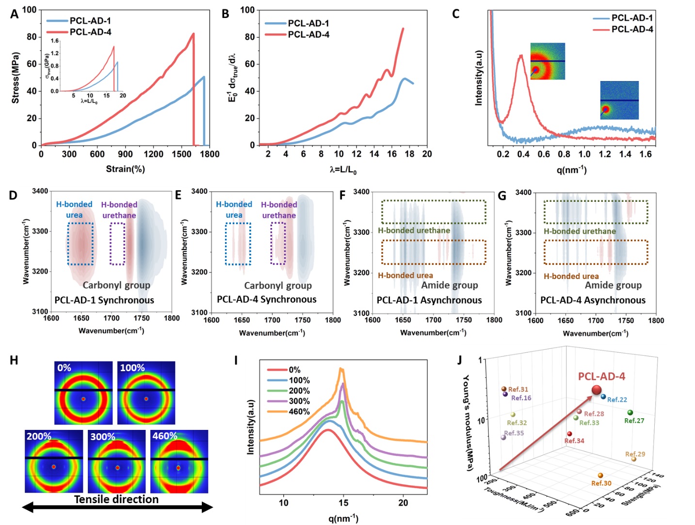 图2.弹性体的拉伸性能、微相分离、氢键和结晶