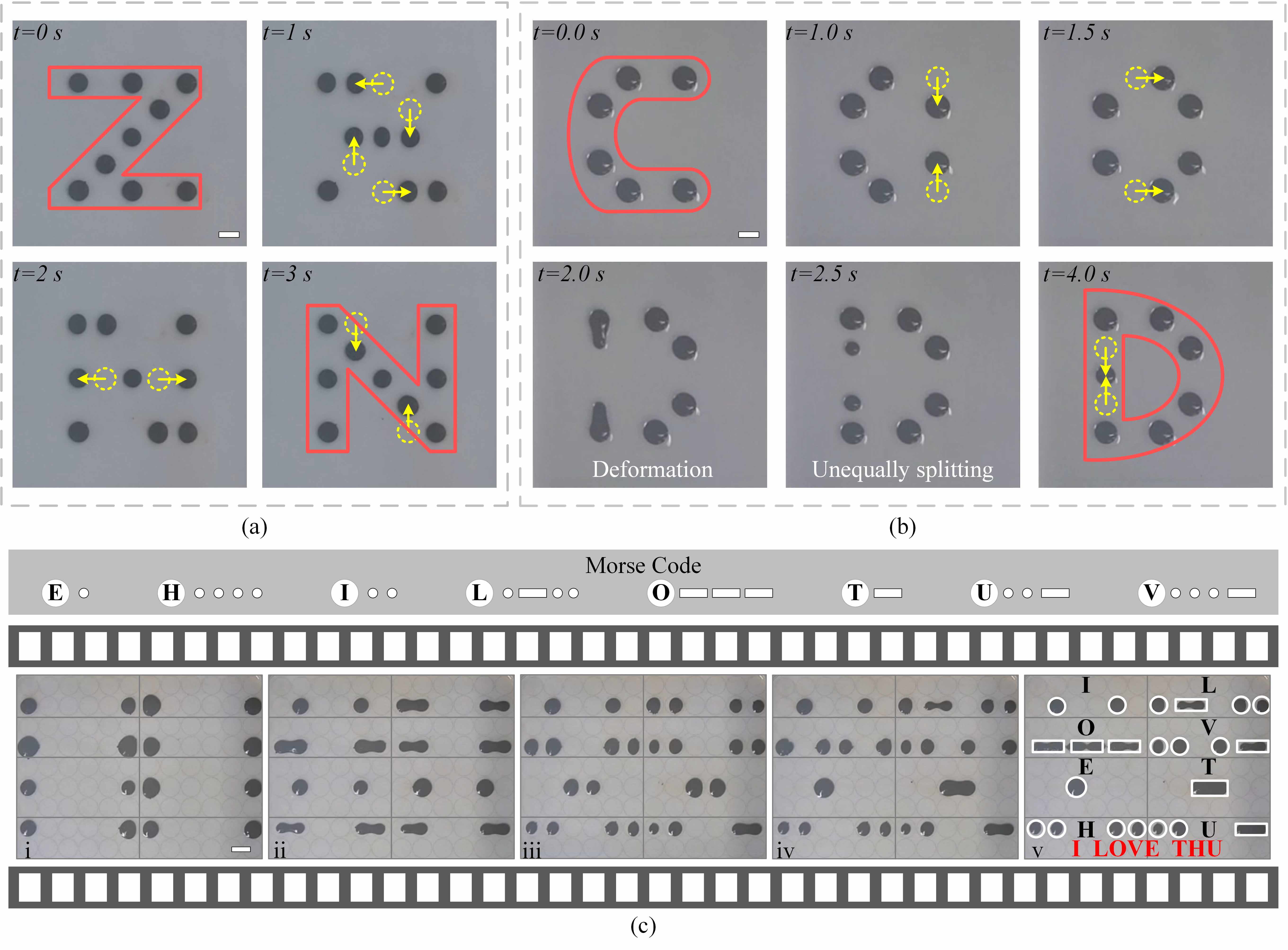 近期,乐鱼在线平台深圳国际研究生院副教授曲钧天团队围绕磁流体液滴机器人在大规模、独立与可编程操控方面的关键技术难题,成功开发出一套基于电磁线圈阵列的可编程操控平台。通过灵活部署液滴机器人,该平台在数字图案显示、信息编码及流体操作等领域展现出广泛的应用潜力。
