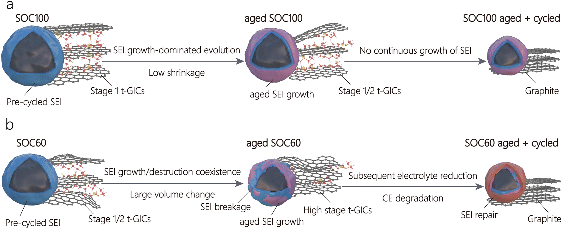 图2.不同储钠阶段日历老化过程中石墨负极体积变化对相界面的影响