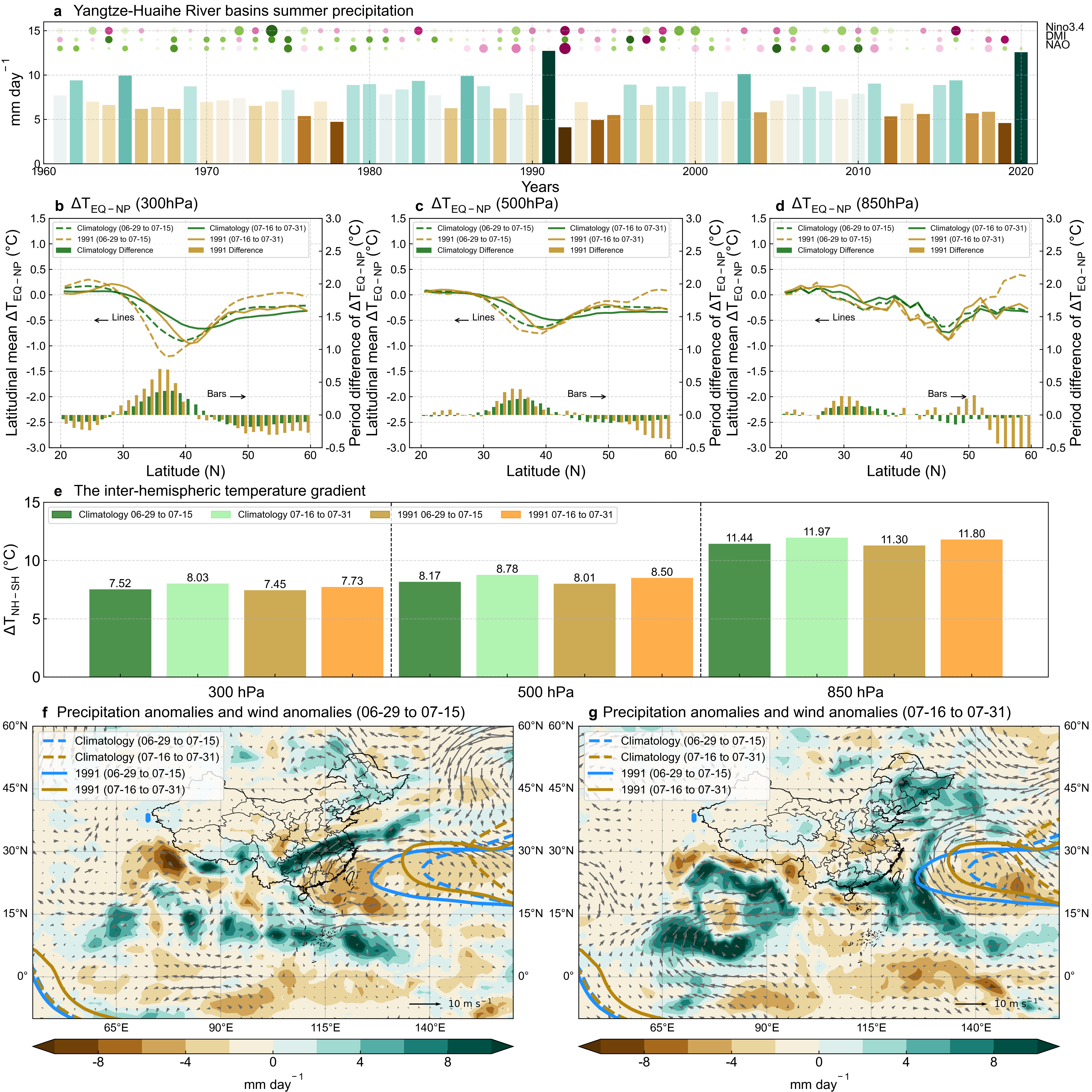机制分析表明(图3),赤道位置SAI通过减小南北半球和赤道–极地温度梯度,引起大气环流结构调整和东亚夏季风减弱,导致东亚副热带西风急流北移、西太平洋副热带高相应压北抬,最终促使中国北方降水增加、南方减少。这一机制得到1991年皮纳图博火山喷发后中国降水变化的观测支持(图4)——该事件对季风平均态的影响及其驱动降水格局改变的机制,与赤道位置SAI的模拟结果高度吻合。