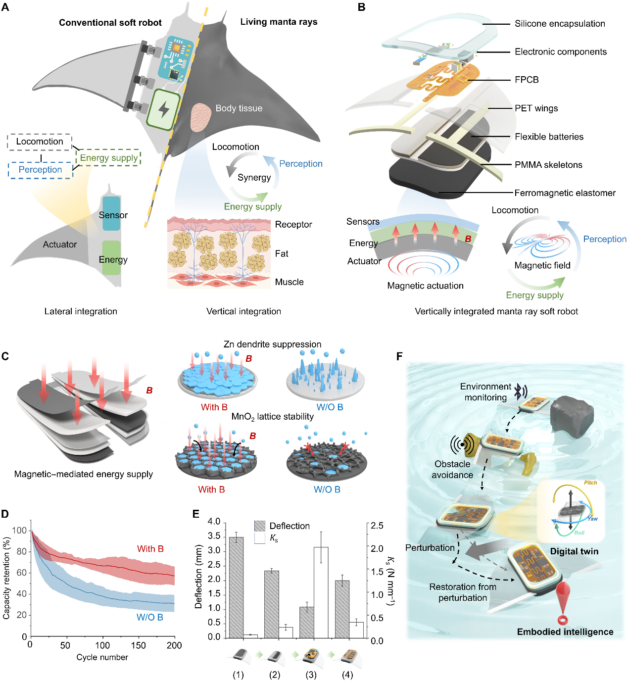 近日,乐鱼在线平台深圳国际研究生院丁文伯副教授所在的智能感知与机器人(Smart Sensing and Robotics, SSR)课题组与周光敏副教授课题组合作提出了一种磁驱动柔性电池集成机器人。该机器人集成的抗形变柔性电池,在机器人固有磁场增强下表现出优异性能,在200次循环后的容量保持率具有57.3%。这种柔顺电池可在机器人本体上实现44.9%的大面积部署,并通过与合理设计的柔性混合电路进行垂直集成,在保持可变形性的同时将额外刚度降至最低。这种执行器–电池–传感器的柔性垂直集成方法最大化了功能区域的利用率,并在仿鳐鱼软体机器人中得以实现,从而构建了一个具备感知、通信和稳定供能能力的无束缚平台。该系统在水下环境中展示了具身智能,包括扰动修正、避障和温度监测等多样化功能,并通过本体感知与环境感知实现了磁驱动运动过程中的实时决策。