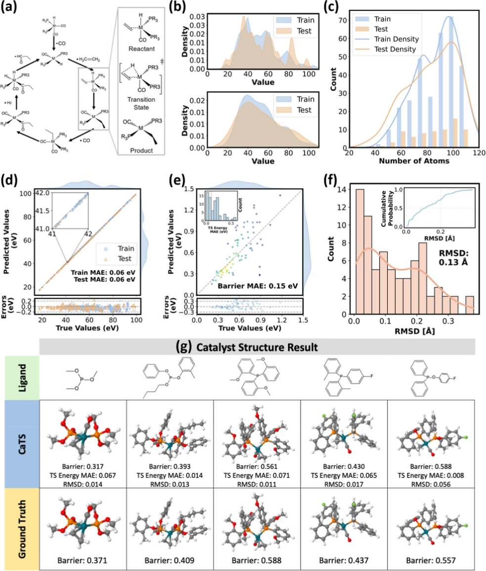 更进一步,团队开发了名为CaTS的过渡态智能筛选框架,瞄准催化剂设计中难度最大、耗时最长的反应动力学优化问题进行攻关。长期以来,过渡态的计算是预测反应速率的关键,但高昂的计算成本是制约大规模筛选的瓶颈。CaTS框架创新性地采用迁移学习策略,仅需数百个催化反应数据即可训练出高精度的机器学习力场,将过渡态搜索的效率提升了近万倍,且在能量和结构预测上均保持了与DFT的高度一致性。相关研究成果以“CaTS:面向催化剂发现的可扩展和有效的过渡状态筛选”(CaTS: Toward Scalable and Efficient Transition State Screening for Catalyst Discovery)为题,于8月27日发表于《美国化学会·催化》(ACS Catalysis)。