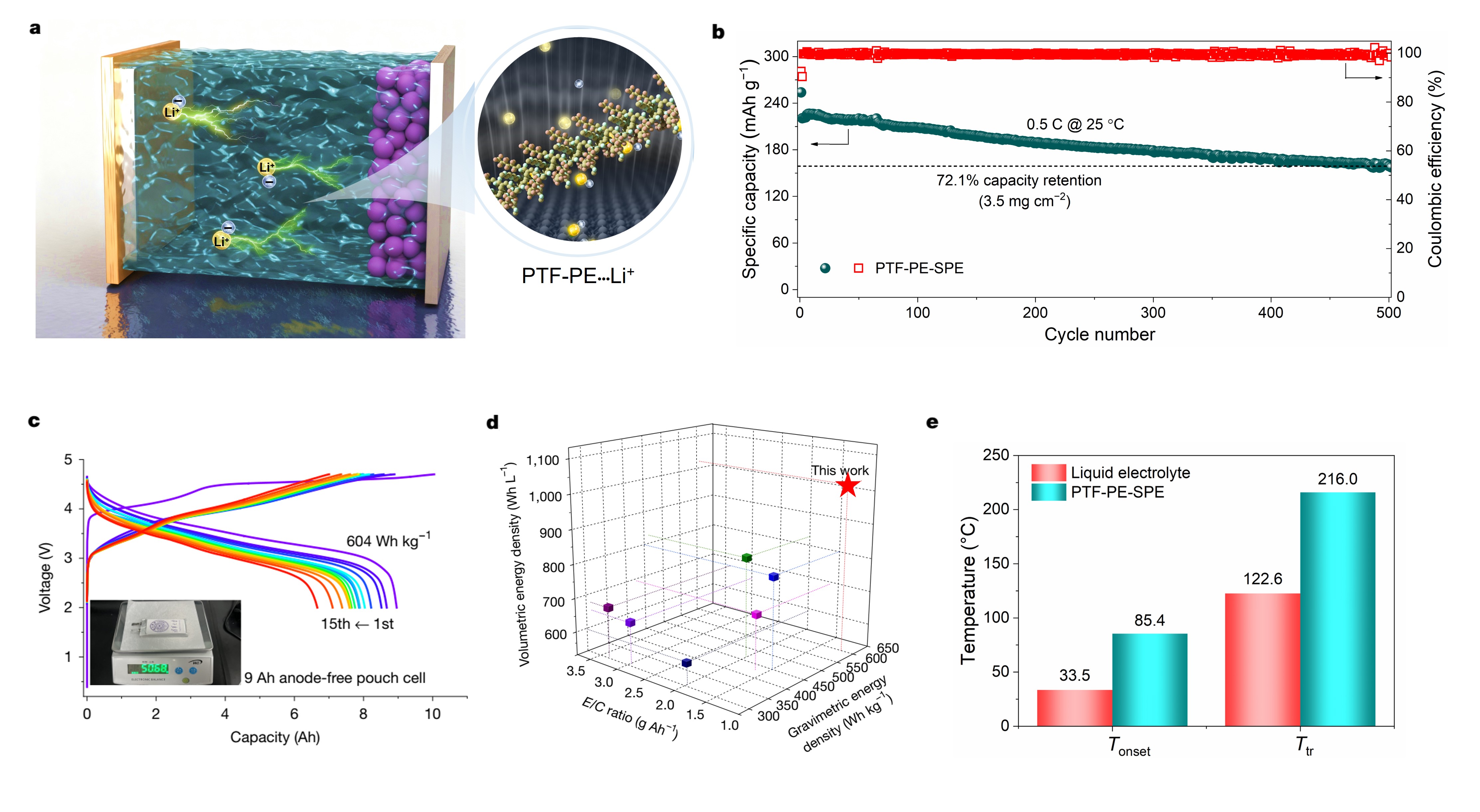 图2.基于含氟聚醚电解质的全电池(a)综合性能卓越:0.5C循环500次容量保持率72.1%(b);8.96 Ah软包电池能量密度达604 Wh kg⁻¹(c),且显著优于其他体系(d)。电池安全性尤为突出,热失控起始温度高,顺利通过针刺与热箱测试