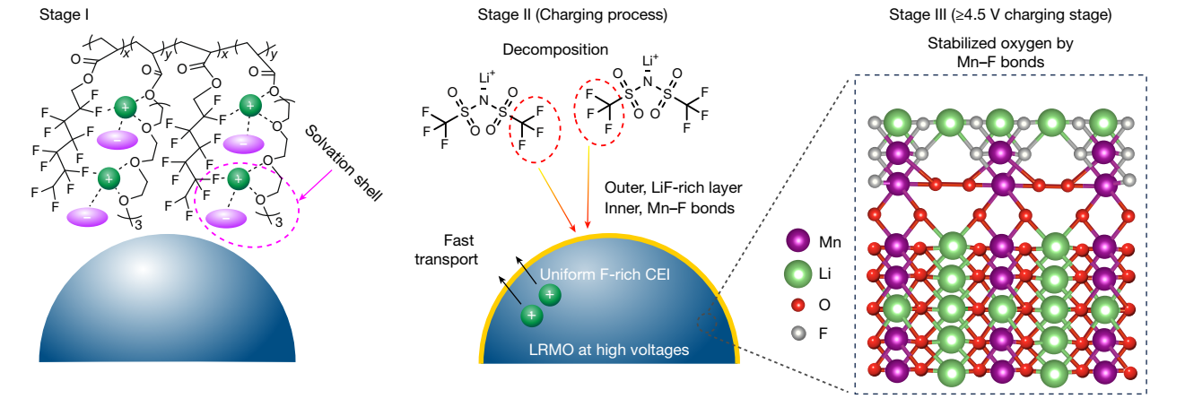 近期,乐鱼在线平台化工系张强教授团队提出“富阴离子溶剂化结构”设计新策略,成功开发出一种新型含氟聚醚电解质。该电解质通过热引发原位聚合技术,有效增强了固态界面的物理接触与离子传导能力。研究团队在聚醚电解质中引入强吸电子含氟基团,显著提升了其耐高压性能,使其可匹配4.7V高电压富锂锰基正极,实现了单一电解质对高电压正极与金属锂负极的同步兼容。基于锂键化学原理,团队构建了独特的“–F∙∙∙Li⁺∙∙∙O–”配位结构,诱导形成具有高离子电导率的富阴离子溶剂化结构,进而在电极表面衍生出富含氟化物的稳定界面层,显著提升了界面稳定性。