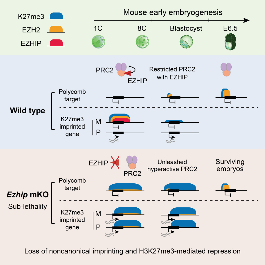 有趣的是,野生型胚胎中亲本来源的H3K27me3不对称性能维持到囊胚阶段,并介导非经典基因印记记忆;而EZHIP缺失后,H3K27me3不对称性在二细胞阶段已经完全丧失,导致非经典基因印记随之丢失。进一步的机制研究表明,着床前胚胎中EZHIP与PRC2能够共同结合在非经典H3K27me3结构域,在染色质上形成H3K27me3-PRC2-EZHIP复合体,以此限制PRC2的酶活和扩散。EZHIP缺失后,PRC2不再被限制,继而在全基因组大部分区域催化了H3K27me3修饰,掩盖了几乎所有亲本来源的H3K27me3记忆。与常规认知相悖的是,这种广泛分布的H3K27me3修饰并未引起全局性基因沉默,反而让H3K27me3丧失了原本的抑制功能,导致非经典印记基因的异常激活和印记X染色体失活的失调。这可能是因为H3K27me3的效应因子(例如PRC1和PRC2)被大量出现的H3K27me3稀释,无法有效富集在正确的靶基因区域,从而导致基因抑制功能失效。另外,EZHIP缺失所造成的H3K27me3在全基因组范围内的过度积累还阻碍了后续多梳靶基因区域H3K27me3的重建,并伴随着胚胎植入后部分致死现象。