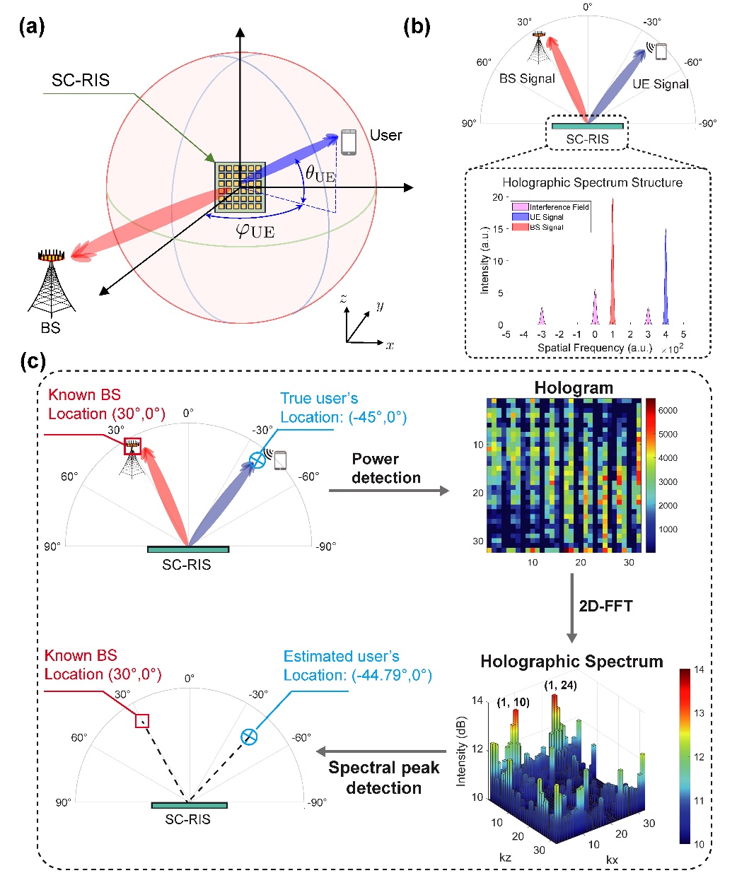 进一步,研究提出了一种基于二维快速傅里叶变换(2D-FFT)的用户角度估计算法,称为全息定位算法(holographic localization)。如图4所示,该全息定位算法首先利用2D-FFT将全息图变换到波数域,形成全息图波数谱。然后,通过最大似然算法可以检测全息图波数谱的双峰结构,并从双峰的位置中反推出用户和基站的相对角度信息。最后,算法可从已知的基站角度中计算出未知的用户角度,从而实现用户定位。