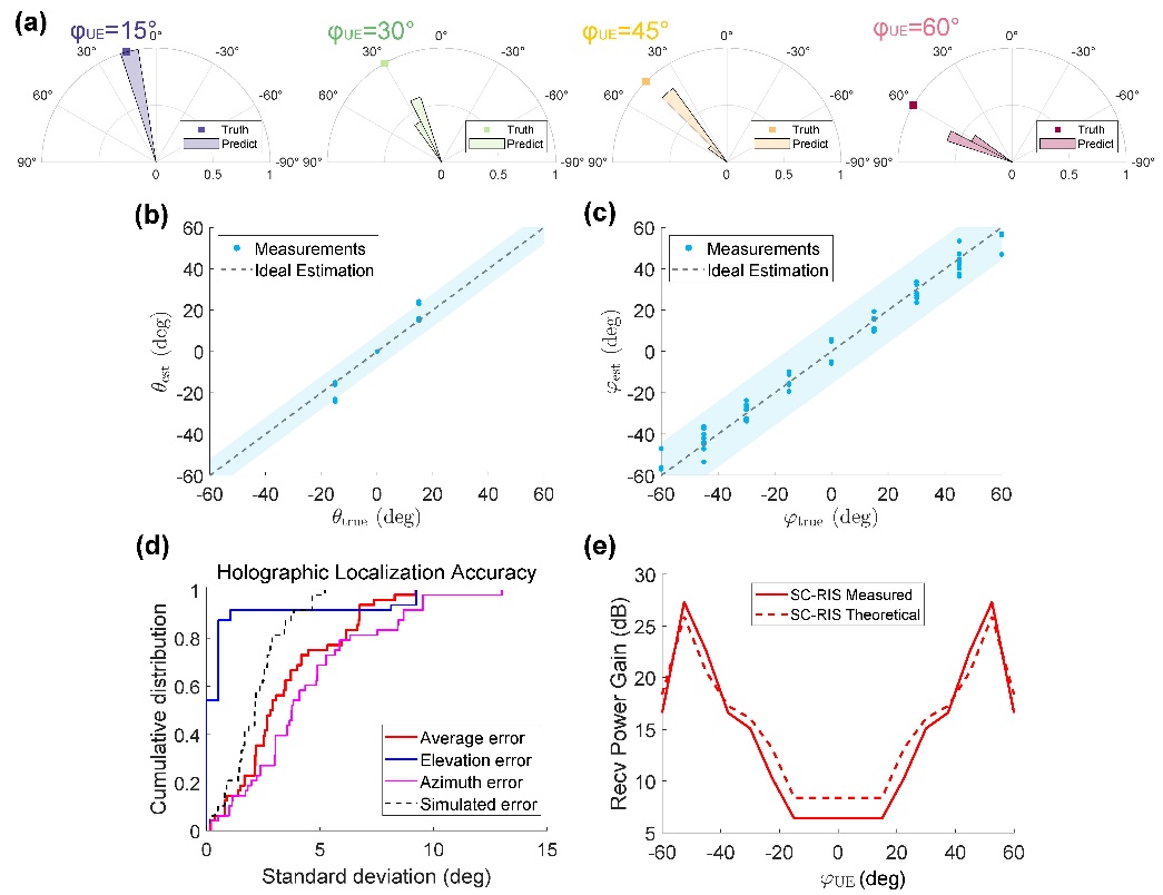 针对所提的SC-RIS硬件架构和算法,研究团队研制了一块32×32单元的SC-RIS硬件,并基于Xilinx FPGA+AD9361构成软件定义无线电平台实现了完整的正交频分复用(OFDM)通信系统,进行了RIS辅助的OFDM通信系统实测。图5中的实测结果表明:在不同的基站-用户角度配置下,该全息定位算法能够将俯仰角和方位角的定位误差分别降低至2.61°与5.24°。受益于最大似然超分辨率算法的应用,全息定位算法的误差可以低于相应阵列分辨率极限(6.62°)。在完成对用户的全息定位之后,就可以根据用户相对于RIS的几何关系来计算RIS赋相矩阵,从而完成RIS波束赋形。实测结果表明,对未调制信息的单音信号,所提RIS闭环控制方案能够在RIS不受基站控制的前提下,相比随机RIS赋相获得16.4dB的用户接收信号功率增益。