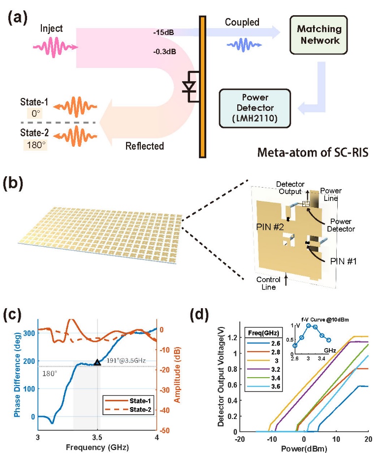 图3.自控制RIS单元的硬件实现及电磁特性
