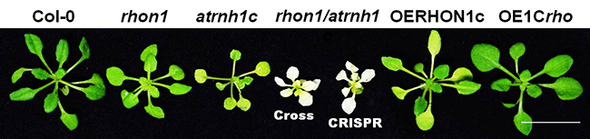 图1:RHON1是一条与AtRNH1C途径相平行的R-loop移除通路。RHON1的过表达(OERHON1c)抑制atrnh1c突变体缺陷,同样AtRNH1C的过表达(OE1Crho)恢复rhon1突变体表型。