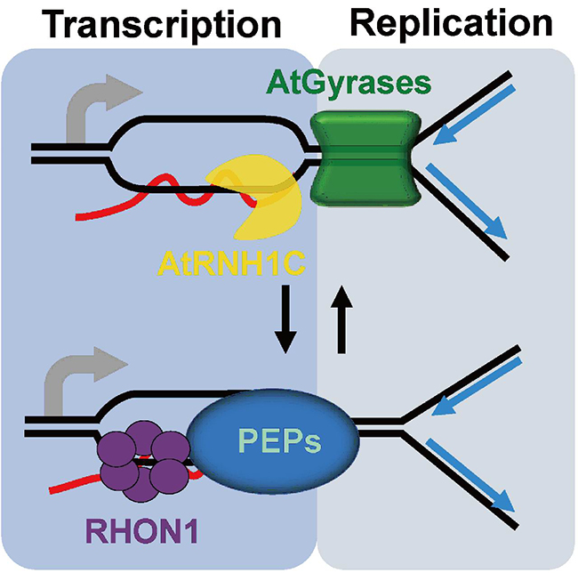 为了更好的建立调控R-loop水平以维持基因组稳定性的调控网络,孙前文实验室以atrnh1c突变体为模型,巧妙的设计了两种筛选策略以寻找参与清除HO-TRCs诱发的R-loop积累从而稳定叶绿体基因组的因子。通过筛选,他们鉴定出了一条与AtRNH1C途径相平行的R-loop移除通路:DNA:RNA解旋酶RHON1介导的R-loop移除。RHON1的过表达可以挽救由于AtRNH1C基因突变引起的HO-TRCs相关的R-loop积累(图1)。进一步研究发现RHON1可以与质体编码的RNA聚合酶(PEP)相互作用,通过协调PEP的转录活性,缓解基因组上转录复制对撞之间的冲突,同时限制和移除叶绿体基因组上形成的R-loop结构,进而维持基因组稳定(图2)。这一研究结果表明,生物利用多种机制逃避HO-TRC诱发的R-loop积累,从而维持基因组完整性。