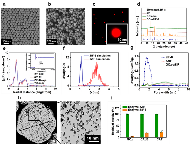 图1. 无定形金属有机骨架纳米颗粒(a)以及酶-无定形金属有机骨架复合物(b)的扫描电镜图;(c)酶-无定形金属有机骨架复合物的超分辨荧光显微镜;(d)X-射线衍射;(e)X-射线吸收精细结构;(f)分子动力学模拟孔径;(g)氮气吸附实验并通过NLDFT模型计算的孔径分布;(h)冷冻电子断层成像术直观观察到的酶-无定形金属有机骨架复合物介孔;(i)包埋酶的表观酶活性。