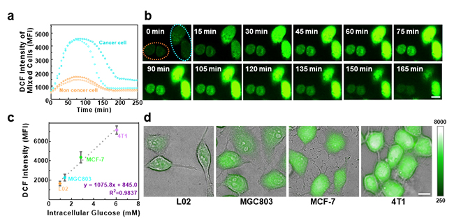 图2. 肝癌细胞和正常肝细胞的荧光强度变化图(a)以及对应的共聚焦系统图像(b);(c)不同细胞胞内葡萄糖浓度和检测荧光强度的关系;各细胞荧光强度达到峰值时的细胞图像(d)。