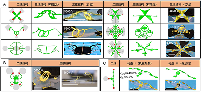 图2:A图为基于介电弹性体组装平台的电控三维组装构型展示,其中灰色区域为电极。比例尺为6mm。B图为利用电控三维组装得到的类青蛙结构。比例尺为10mm。C图为利用力-电耦合加载得到的一种三维可重构结构,构型I对应基底同步卸载后得到的组装结果,构型II为在构型I基础上进行电控组装得到的组装结果,比例尺为10mm。
