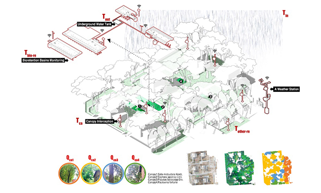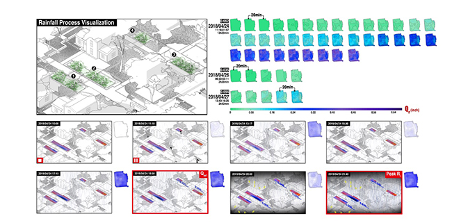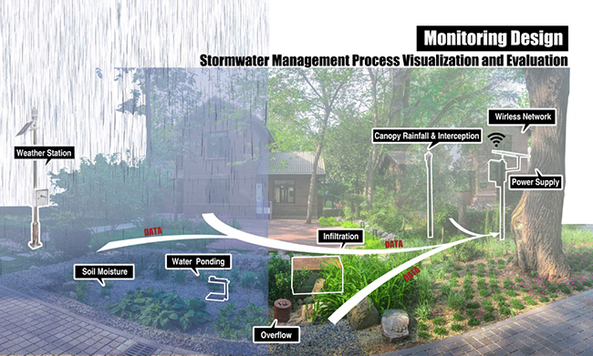 美国风景园林师协会学生奖评委会如此评价这一研究:这个杰出的研究项目代表着风景园林师在提供雨洪管理实时有效的监测工具(不仅限于模拟和标准计算)方面迈出了重要的一步。该研究使用太阳能与无线传感网络连接了各种监测设备和传感器,评估了树木冠层和生物滞留池对径流的影响,并建立了基于科学的后评估模型。随着雨洪管理和韧性设计变得越来越重要,收集到的定量评估数据变得非常珍贵,这不仅可以支撑方案得有效性,而且有利于在业主和公众中建立对该领域工作的认可。
