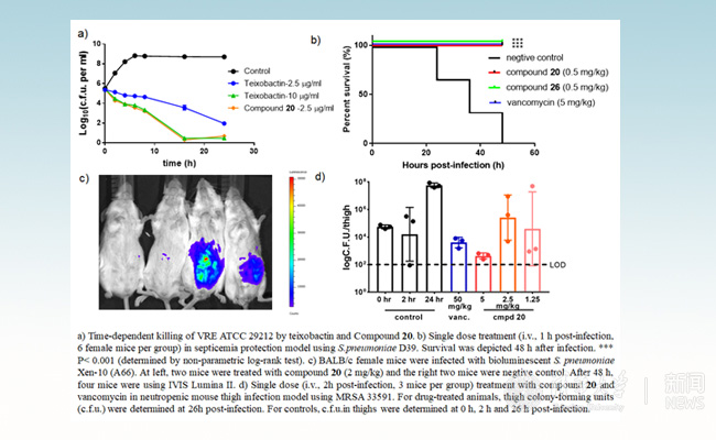 接下来,该课题组通过3+2+6的汇聚式合成策略,成功避免了前人在全合成中的副反应,首次实现了teixobactin的克级全合成。由于采取汇聚式合成路线,在构效关系研究的过程中,只需要对相应的合成模块进行改造,即可快速得到一系列基于teixobactin的抗菌库。最终该课题组发现类似物20和26展现出了更强的抗菌活性,这两个候选化合物近一步在动物体内展现了强大的抗菌活性。