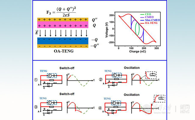 乐鱼(中国)网7月10日电 近日,乐鱼在线平台微纳电子系王晓红教授课题组与美国佐治亚理工学院王中林教授课题组在《先进能源材料》杂志(Advanced Energy Materials,影响因子:24.88)上线发表了题为“通过电路振荡以实现纳米摩擦发电机的性能提升”(“Boost the Performance of Triboelectric Nanogenerators through Circuit Oscillation”)的合作论文,首次提出一种通过自由电荷极性翻转提升电极等效电荷面密度的电源管理方法,进而突破了长期以来摩擦纳米发电机单周期内最大输出的限制。