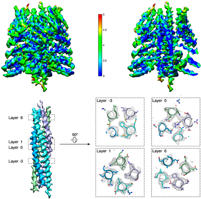 图1 α-SNAP-SNARE亚组装体电镜结构的分辨率分布和典型氨基酸残基的密度图