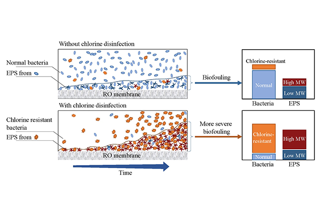 RO膜的生物污堵是污水再生处理RO工艺高效、稳定运行面临的突出难题。目前,主要通过消毒预处理削减RO系统进水中的微生物量、在运行中投加非氧化性抑菌剂等手段对其进行控制。氯消毒是污水处理过程中最常用的微生物灭活手段。然而,该研究却发现氯消毒虽然可有效灭活反渗透(RO)系统进水中的微生物,但却导致了更加严重的生物污堵。