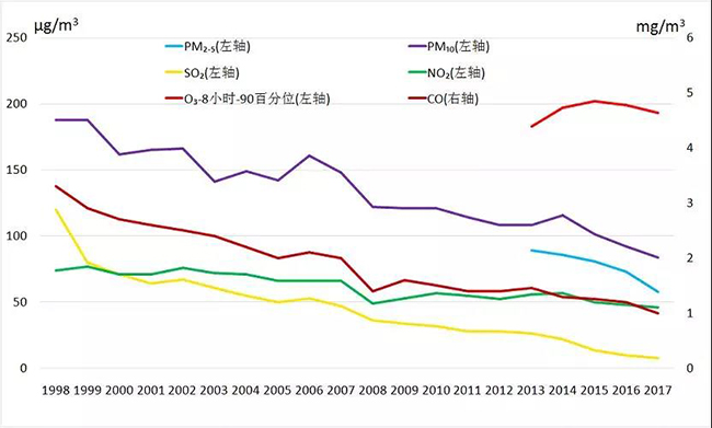 报告指出,1998-2017年这20年间,北京市在经济社会高速发展的情况下,分阶段持续实施有力的大气污染综合治理措施,全市的污染物排放强度逐年下降,空气质量明显改善,二氧化硫(SO2)、二氧化氮(NO2)和可吸入颗粒物(PM10)年均浓度较1998年分别下降了93%,38%和55%。北京市在大气环境质量改善方面所做的努力为全球其它城市,尤其是发展中国家城市提供了值得借鉴的经验。