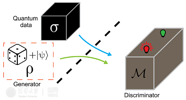 量子生成对抗网络(QGAN, quantum generative adversarial network) 基本原理与经典的GAN是一样的,区别在于这里生成器和判别器是由量子器件或者量子网络构成,训练用的数据集也可以是量子数据(如量子态等)。孙麓岩课题组与合作者在超导系统中首次实现了GAN,展示了从量子数据集中学习有用模式的可行性。在此实验中,生成器由一个能以一定概率分布产生量子态系综的超导量子线路组成,判别器是一个可以做投影测量的量子器件,训练用的真实数据集由一个量子通道模拟器产生。