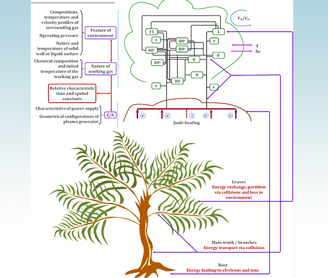 “能量树”概念的核心思想是:作为粒子集合体和能量载体的碰撞等离子体,在从气体击穿、等离子体维持直到消亡的整个过程中,能量的注入–再分配–损失始终与体系的动量交换和粒子平衡过程强烈耦合;而体系中能量的注入、再分配以及损失将受到等离子体发生器结构参数和运行参数以及环境参数等诸多因素的影响,形成所谓的“能量树”结构。