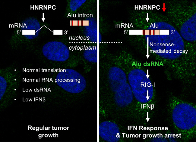 基因组中包含大量Alu或Alu片段的重复序列,蛋白编码基因的内含子区同样有大量Alu。正常的RNA剪接机制会将这些Alu内含子排除在成熟的mRNA分子之外,而HNRNPC在此过程中扮演了重要的把关者的角色。课题组的研究证明当HNRNPC表达量不足以维持正常的RNA剪接时,许多Alu内含子序列会保留在成熟的mRNA分子中并被转运出核。这些mRNA不能被正常翻译,因此会激活无义介导的RNA降解(nonsense-mediated decay,NMD)。Alu序列在这些mRNA中往往以双链RNA结构的形式存在,而这些双链RNA结构通常比较难于被降解,因此当其所在的异常mRNA分子被各种内切及外切酶处理以后,Alu序列被保留下来,成为细胞内独立存在的小片段双链RNA并大量累积,最终直接诱发了肿瘤细胞内干扰素信号通路,激活下游免疫反应。