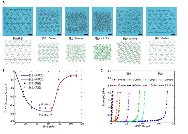 在《科学进展》论文中,研究团队首先展示了网状材料的吸水变形和脱水回复的过程,验证了网状材料的变形可逆性;详尽阐述了网状材料的变形机制以及调控原理,建立了定量的力学预测模型;通过有限元仿真和理论分析,提出了具有非常规溶胀行为的超材料设计方法,并实现了网状材料力学性质的各向异性调控。研究表明新设计的网状材料具有独特的“J”型应力-应变曲线,通过控制吸水时间,可以精确控制网状材料的弹性模量及临界应变等力学性质,在可展开天线和软体机器人的构型主动控制方面有着重要的潜在应用。