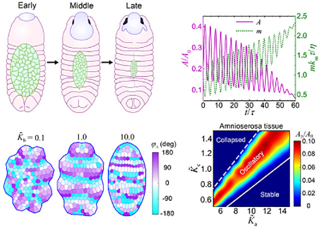果蝇胚胎发育过程中羊浆膜群体细胞振荡力学机制(左上)果蝇胚胎背部闭合过程示意图;(右上)果蝇胚胎背部闭合过程细胞面积与肌球蛋白活性演化的数值模拟;(左下)边界刚度对群体细胞振荡模式的调控;(右下)细胞弹性和主动收缩对群体细胞动力学行为的调控。
