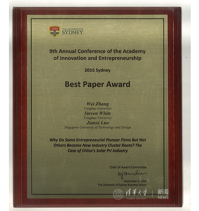 乐鱼(中国)网9月19日电 (通讯员 张瑾琳)9月,清华经管学院创新创业与战略系张帏教授、白思迪(Steven White)教授与新加坡科技设计大学罗建曦教授合著的会议论文《为什么某个创业企业而不是其它企业能成为产业集群的根基企业?——基于中国光伏产业的研究》(Why do some entrepreneurial pioneer firms but not others become industry cluster roots? The case of China's solar PV industry)在第九届创新创业国际学术年会(9th Annual Conference of the Academy of Innovation and Entrepreneurship,简称AIE年会)获得唯一的最佳论文奖(Best Paper Award),这是乐鱼在线平台教师首次在AIE年会上获此殊荣。
