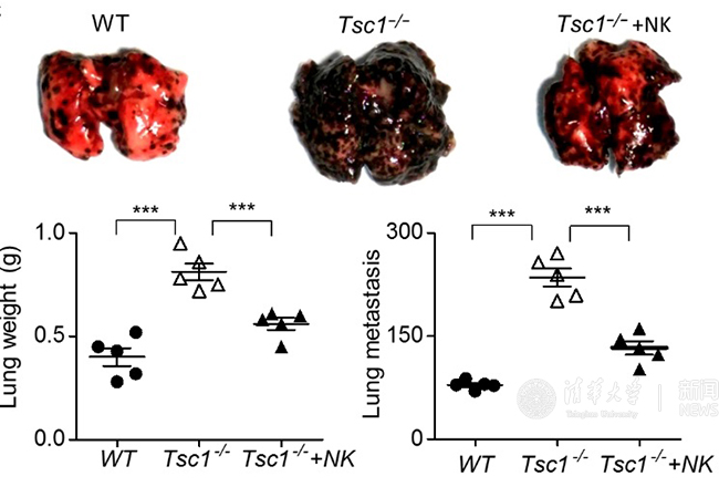 经过对能量代谢信号通路的筛选,董忠军课题组发现NK细胞在IL-15刺激的后期会负反馈方式上升Tsc1,该蛋白可以通过抑制mTORC1, 从而防止NK发育过程中过度活化。通过多种NK细胞发育阶段特异性的基因敲除,他们发现Tsc1在维持早期NK细胞的静息状态发挥重要作用,早期Tsc1丢失将导致过度mTORC1活化,NK细胞数目严重下降,Tsc1小鼠不能排斥异基因骨髓移植物以及不能抑制黑色素瘤肺转移(图1)。在分子机制上,他们发现过度mTORC1活化,NK细胞丧失了对IL-15诱导的E4BP4表达,但是IL-15刺激却导致T-bet的上调,后者抑制了Eomes的表达。因此,他们首次发现Tsc1依赖的负反馈机制,通过抑制IL-15诱导的能量代谢,确保NK细胞在其发育早期维持合适的IL-15反应性(图2)。