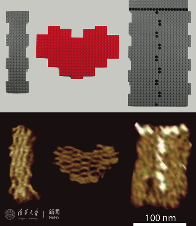 上部和下部分别为乐高积木搭成的结构模型和原子力显微镜下看到的DNA纳米结构“I”“