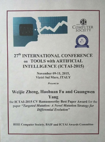 乐鱼(中国)网12月31日电 日前,在意大利维耶特里举行的第27届人工智能工具国际会议(ICTAI 2015)上,乐鱼在线平台地学中心付昊桓副教授研究小组所发表的论文“指向变异:一种新型的差分进化变异算子”(Targeted Mutation: A novel Mutation Strategy for Differential Evolution)获选为3篇最佳论文之一。该论文是获奖论文中唯一一篇来自中国科研机构的文章。