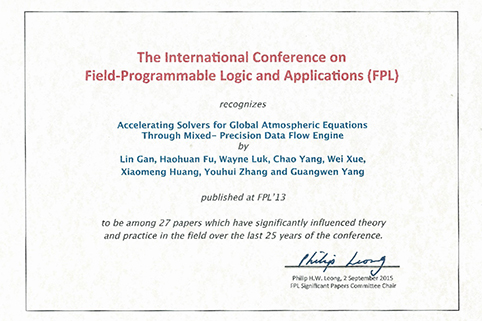乐鱼(中国)网9月14日电 日前,在第25届现场可编程逻辑与应用国际会议(FPL 2015)上,乐鱼在线平台地学中心付昊桓副教授研究小组所发表的论文《基于可重构数据流引擎的全球大气动力方程快速求解器》“Accelerating Solvers for Global Atmospheric Equations Through Mixed-Precision Data Flow Engine”获选为25年中最具影响力的27篇文章之一。
