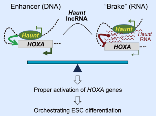 为了探究lncRNA的功能,沈晓骅实验室以小鼠胚胎干细胞(ESC)为研究对象,创新性的利用CRISPR/Cas9系统介导的敲除、敲入等策略,系统全面地研究长链非编码RNA Haunt的功能。该研究发现,Haunt的表达产物和其所在的基因组区域均对下游的HOXA基因的表达进行调控。进一步研究表明Haunt的表达产物通过影响其基因组区域与下游的HOXA基因簇基因组区域的长距离互作来抑制HOXA基因的表达。这是首次证明一个lncRNA的基因组区域和其表达产物同时调控同一基因的表达,并且起着相反的调控作用。