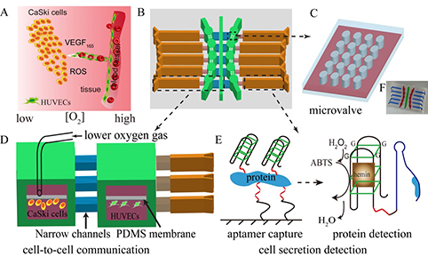 缺氧环境对促进肿瘤的生长、侵袭以及转移都有较大的影响。因此,体内氧气微环境对肿瘤发展的影响一直是肿瘤研究中的热点。目前常用的缺氧培养箱无法模仿细胞在体内生长的复杂微环境,如生物分子浓度梯度,也无法实现氧梯度的精确控制。微流控芯片装置的出现为体外模拟氧梯度微环境提供了一个合适的平台,通过对芯片的设计,控制它的关键要素如扩散距离,能够在微米尺度上模拟细胞和组织之间氧梯度的微环境。