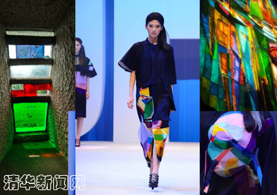 王开羽的作品《渥彩》灵感来自于光。光是最美的, 最炫目的事物。当阳光从教堂的彩色玻璃中透入,光线在透过玻璃窗时改变了颜色,五彩斑斓的光斑将昏暗的环境点亮,使人联想起宝石般绚烂的天堂景象。在设计中采用了整块布折叠的立体几何结构,将规整的玻璃形状打散重叠,随着服装结构的转折,使几种透明印花图案重叠出更丰富的色彩。