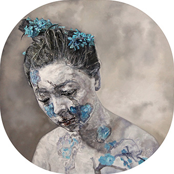 玉人歌系词牌名,“玉人”形容面容姣好的女性。莫芷作品《玉人歌之蓝》中“花”和“人”失其本“相”而相互杂糅。“花” 作为传统文人的意向性符号,与“人”作为实际存在的具体形象,二者重叠、对应,共同营造新的视觉语境,以捕捉古典文化与现代性异质情境的偶合。