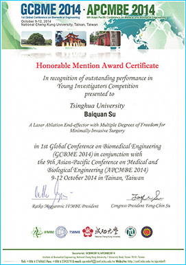 乐鱼(中国)网10月17日电 10月11日,在台湾成功大学举办的第一届全球生物医学工程会议暨第九届亚太地区医学生物工程学术会议(GCBME2014- APCMBE 2014)上,乐鱼在线平台医学院生物医学工程系博士后苏柏泉博士发表的论文“A Laser Ablation End-Effector with Multiple Degrees of Freedom for Minimally Invasive Surgery”(用于微创手术的多自由度激光烧蚀末端操作器)获得Young Investigator Competition(青年组)论文荣誉奖(Honorable Mention Award)。