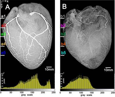 图为基于液态金属镓(A)和碘海醇(B)的猪心脏冠状动脉造影效果对比。
