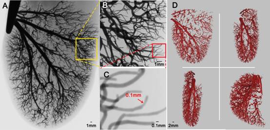 血管网络作为遍布全身的血液循环通道,其尺寸大小、分布和空间走向对机体代谢、营养和药物的输运等至关重要,同时血管自身也面临着诸多病变威胁,无论在健康检查还是疾病诊治中,血管的异常生长与变化均是衡量病理状况与疾病发生发展的重要指标。为此,获取高质量的血管图像对于病理学、解剖学研究具有十分重要的意义。早期,由于受技术限制,科研人员大多通过解剖、冷冻切片、染色、数字化重建等方法获得血管分布信息,程序繁琐复杂,且操作过程易于破坏血管结构及走向,导致结果与实际存在偏离。随着影像学的发展,血管造影成为一种重要的成像方法,但无论是常用的碘化合物增敏剂还是当前颇受关注的纳米材料,其血管造影能力仍然有限,尤其对于一些复杂的微细血管,成像质量尚不十分理想,这就使得对超高清晰度血管图像的获取长期成为挑战。