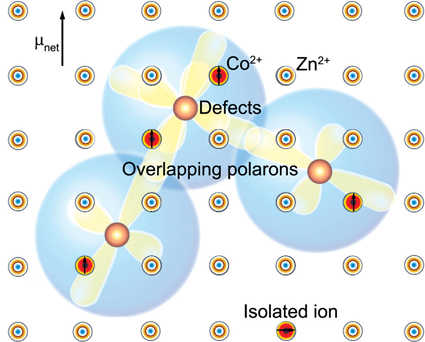 钴掺杂氧化锌的磁性机制示意图。