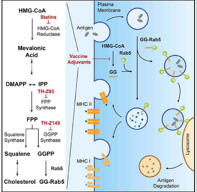 甲羟戊酸通路是被广泛研究的代谢通路, 已有他汀类及双膦酸类药物被广泛应用于降胆固醇及抗骨质疏松。张永辉团队通过系统的药学研究,发现亲脂性的他汀类药物以及理性设计的双膦酸类药物在小鼠中都有很好的佐剂效果,并揭示其作用机制与胆固醇的调节无关。