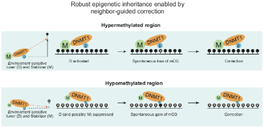 通过“临近区域依赖修正机制”所介导的DNA甲基化稳定且可塑性遗传。该机制依赖于DNMT1从头甲基化活性和不精确维持活性