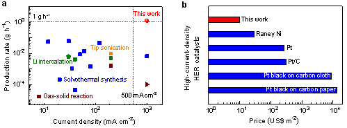 此外,该催化剂在大电流密度下具有良好的稳定性,表现出优异的电解水性能。为进一步验证并推广该制备策略,团队采用低成本钼矿自然资源为原料制备电催化剂,测试表明所制备的矿物基电催化剂具有良好的电催化性能以及放大生产能力,其中所用的钼矿成本仅为铂价格的十万分之一,有望推动该低成本高性能电催化剂的工业化应用。研究显示,该制备方法是目前最为高效的二维材料电催化剂制备方法,其制备速率优于已报道结果1~2个数量级,所得电催化剂是目前大电流密度下性能最佳的催化剂之一。以上研究结果对二维材料的产业化应用,以及低成本矿石自然资源的高附加值应用具有指导意义,相关策略还有望进一步拓展至其他材料及反应体系中。