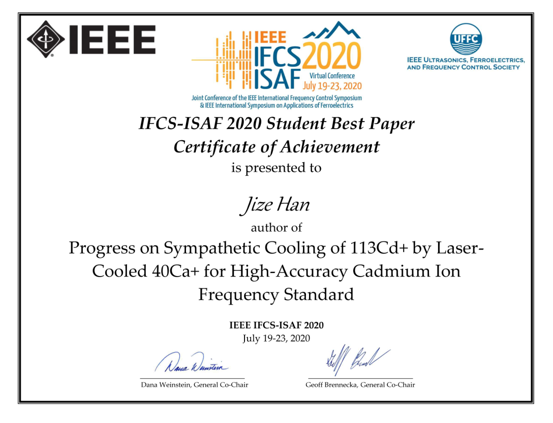 国际频率控制和铁电应用联合大会由国际电气与电子工程师学会(IEEE)超声波、铁电和频率控制协会(UFFC-S)主办,是时间频率控制领域影响最大的国际学术会议之一,涵盖了谐振材料和器件、谐振合成器噪声和电路技术、微波量子频标及应用、传感器和变频器、时间频率分发和全球卫星导航系统及应用(GNSS)、光频标及应用6个不同的领域,自1947年举办至今已有70余年历史。2020年度的会议原定于今年7月在美国科罗拉多州基斯通召开,但由于受到全球范围内新冠肺炎疫情的影响,改为线上会议。大会技术委员会通过审查全世界范围内参与学生评比的论文,选出了6个不同领域的入围名单,最终评审委员会根据论文工作的质量和内容、对社会的意义、学生在论文工作的贡献和展示的质量,分小组评定出其优胜者。韩济泽获奖论文所在小组有来自美国国家标准与技术研究院(NIST)、法国巴黎天文台等世界一流研究机构的学生。