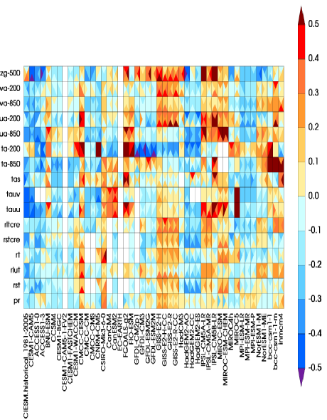 采用气候模式诊断和比较计划(PCMDI)标准诊断包分析的乐鱼在线平台联合地球系统模式历史模拟性能和其他CMIP5模拟的比较(全球平均)。颜色代表模式均方根误差相对于多模式平均偏差的差异,颜色越蓝性能越好。一个方格内的四个三角形代表春夏秋冬。第一列为乐鱼在线平台联合地球系统模式,不同行表示不同的变量。