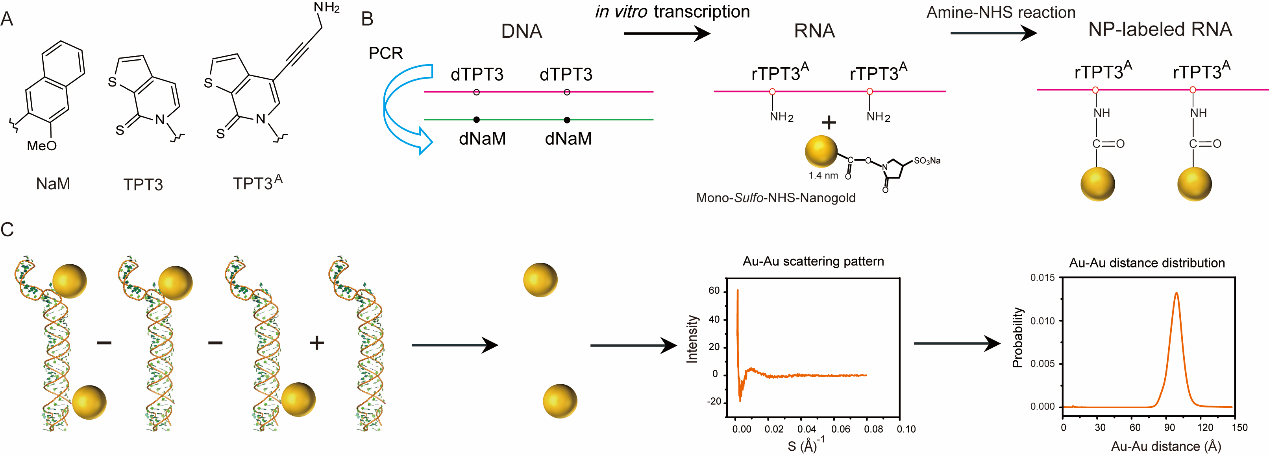图1 基于拓展遗传密码体系的长链RNA位点特异性金纳米颗粒标记技术及其在X射线散射干涉中的应用