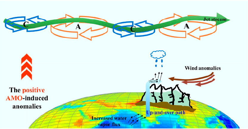 基于以上背景,阳坤教授研究组分析了1979~2018年与羌塘高原变湿过程相关的大气环流及水汽变化特征。研究结果表明,该变湿过程与青藏高原上空减弱的西风相对应,后者在年代际尺度上又受北大西洋多年代际振荡(AMO)的调控。自20世纪90年代中期以来,AMO一直处于暖位相(即北大西洋表面异常增暖),诱发了一系列沿欧亚大陆副热带西风急流传输的气旋和反气旋异常,导致青藏高原附近的副热带急流异常北移和/或减弱。具体过程如图2所示。从图2可以看到,在羌塘高原东侧存在一个异常反气旋,其西侧存在一个异常气旋。前者减弱西风,使得西风携带的水汽不能进一步向东输送,从而在羌塘高原上空聚集;后者则使得羌塘高原南侧的西南风增强,有利于来自阿拉伯海的水汽进入羌塘高原。因此,上述有利的动力和水汽条件共同增强了羌塘高原上空的水汽辐合,使得自20世纪90年代中期以来,羌塘高原夏季降水增加。考虑到未来10年AMO可能仍处于正相位,预计羌塘高原近期夏季降水仍以偏多为主,有利于湖泊扩张。